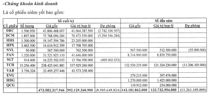 Theo thuyết minh, tại ngày 30/9, NTL đang dành gần 474 tỷ đồng để đầu tư chứng khoán, gấp 3 lần so với hồi đầu năm với các mã DBC, DCM, HHS, HPX, NVL, PAN, SGT, TCH, VAB. Giá trị hợp lý của các cổ phiếu này tại cuối tháng 9 là hơn 592 tỷ đồng.
