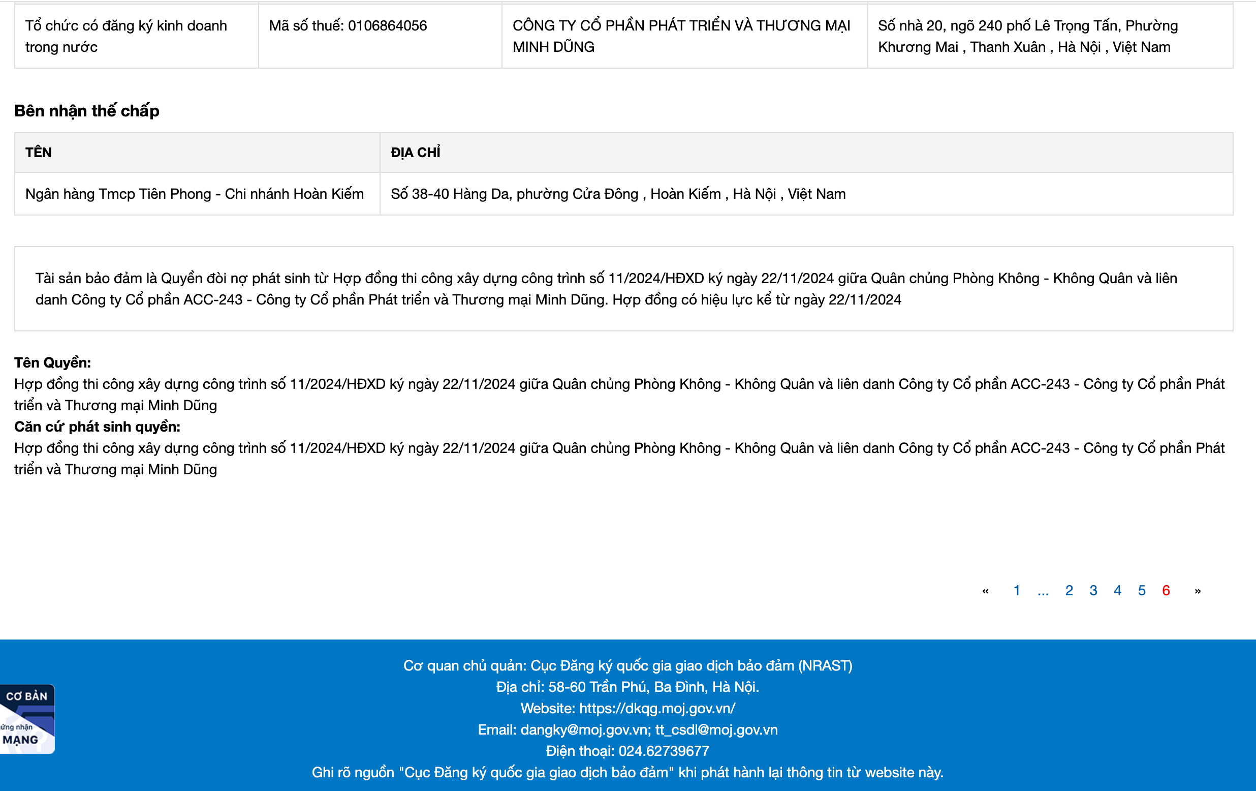 Đơn cử, ngày 20/12/2024, Thương mại Minh Dũng đã thế chấp quyền đòi nợ phát sinh từ Hợp đồng thi công xây dựng công trình số 11/2024/HĐXD ký ngày 22/11/2024 giữa Quân chủng Phòng Không - Không Quân và liên danh Công ty Cổ phần ACC-243 - Công ty Cổ phần Phát triển và Thương mại Minh Dũng. Hợp đồng có hiệu lực kể từ ngày 22/11/2024, thế chấp tại ngân hàng TPBank - Chi nhánh Hoàn Kiếm.