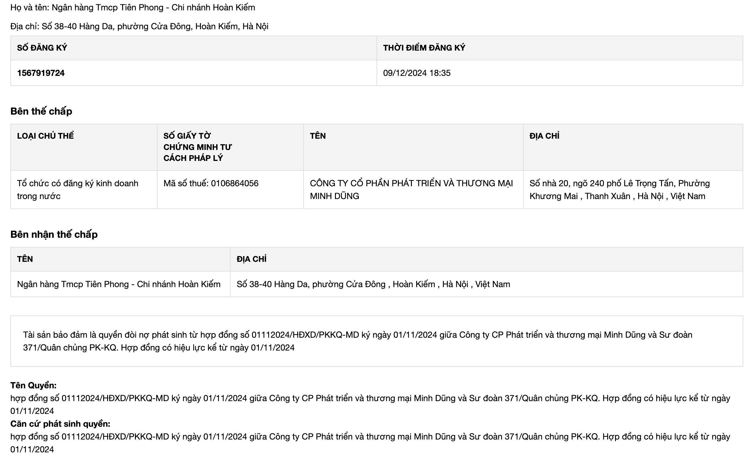 Trước đó, ngày 22/11/2024, Thương mại Minh Dũng đưa quyền đòi nợ thuộc sở hữu của công ty: Là quyền yêu cầu Sư đoàn 371/Quân chủng PK-KQ phải thanh toán khoản tiền phát sinh từ các hợp đồng được ký kết giữa hai bên, làm tài sản bảo đảm để thế chấp tại Ngân hàng MSB - Chi nhánh Hà Nội.