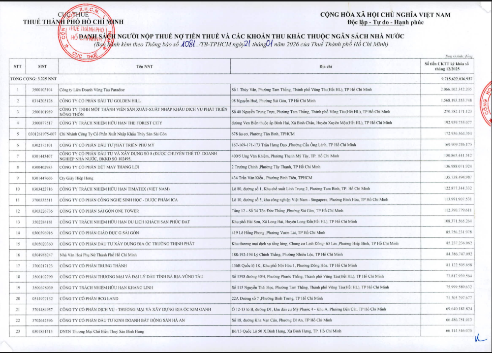 Theo thông báo số 1081/TB-TPHCM của Thuế TP. Hồ Chí Minh, tính đến tháng 12/2025, trên địa bàn có 3.225 trường hợp nợ thuế, với tổng số tiền trên 9.715 tỷ đồng. Những trường hợp trên vi phạm quy định điểm a khoản 1 Điều 100 Luật Quản lý thuế và điểm g khoản 1 Điều 29 Nghị định 126/2020/NĐ-CP của Chính phủ.