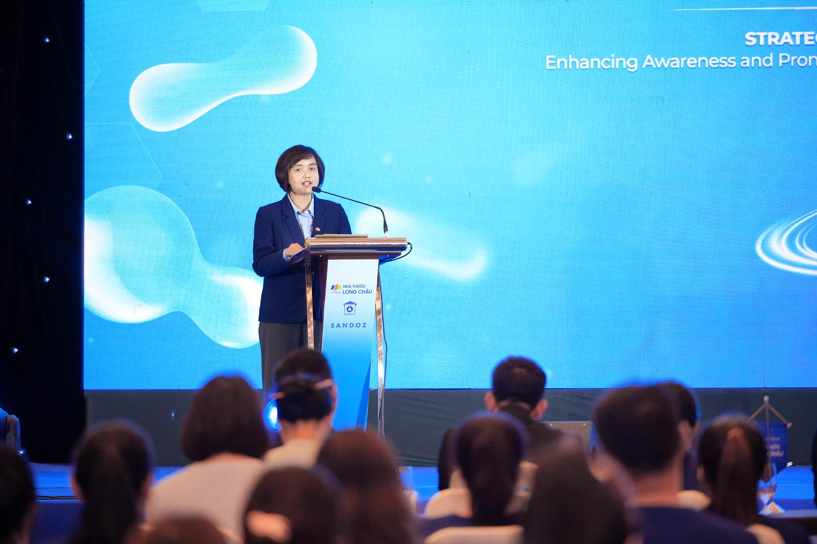 Bà Nguyễn Đỗ Quyên - Phó Tổng Giám đốc FPT Retail kiêm Giám đốc Điều hành Hệ thống nhà thuốc và Trung tâm tiêm chủng Long Châu nhấn mạnh vai trò của dược sĩ cộng đồng trong chăm sóc sức khỏe người dân.