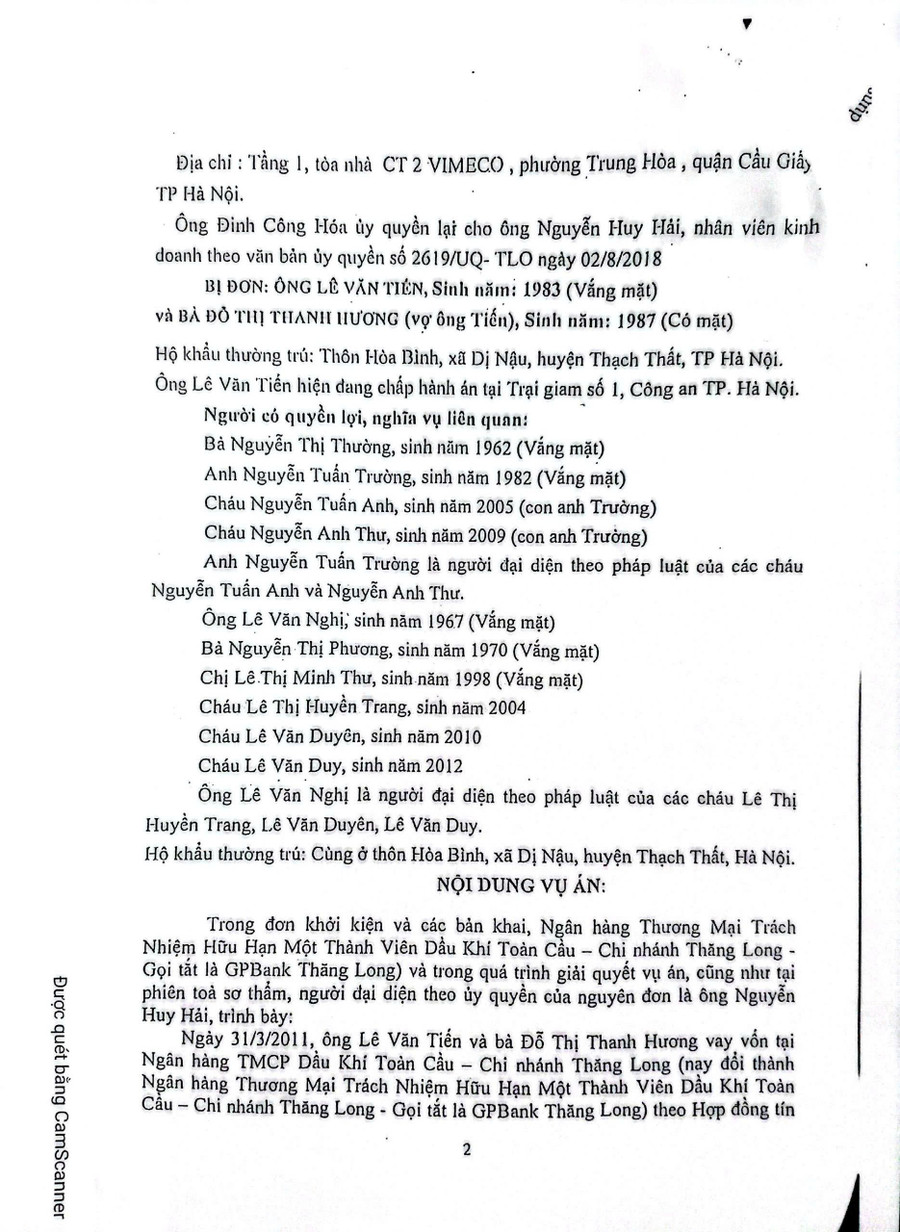 Do vi phạm nghĩa vụ thanh toán hợp đồng tín dụng, GP Bank đã khởi kiện vợ chồng ông Lê Văn Tiến tại Toà án nhân dân (TAND) huyện Thạch Thất (nay là Toà án nhân dân khu vực 10 – Hà Nội) để yêu cầu giải quyết tranh chấp hợp đồng tín dụng giữa hai bên.