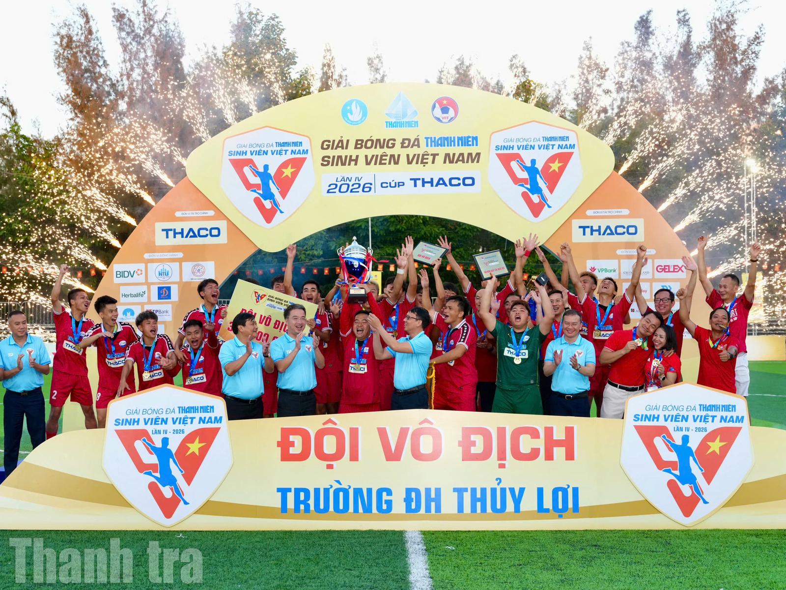 Vượt qua Trường ĐH Công nghiệp TP.HCM với tỷ số 4-0 trong trận chung kết diễn ra chiều 22/3 tại Trường ĐH Nha Trang, Trường ĐH Thủy lợi chính thức vô địch Giải bóng đá Thanh niên Sinh viên Việt Nam lần thứ IV - 2026 Cúp THACO. Giải đấu khép lại sau hơn hai tuần tranh tài sôi nổi, quy tụ 12 đội bóng sinh viên trên cả nước.