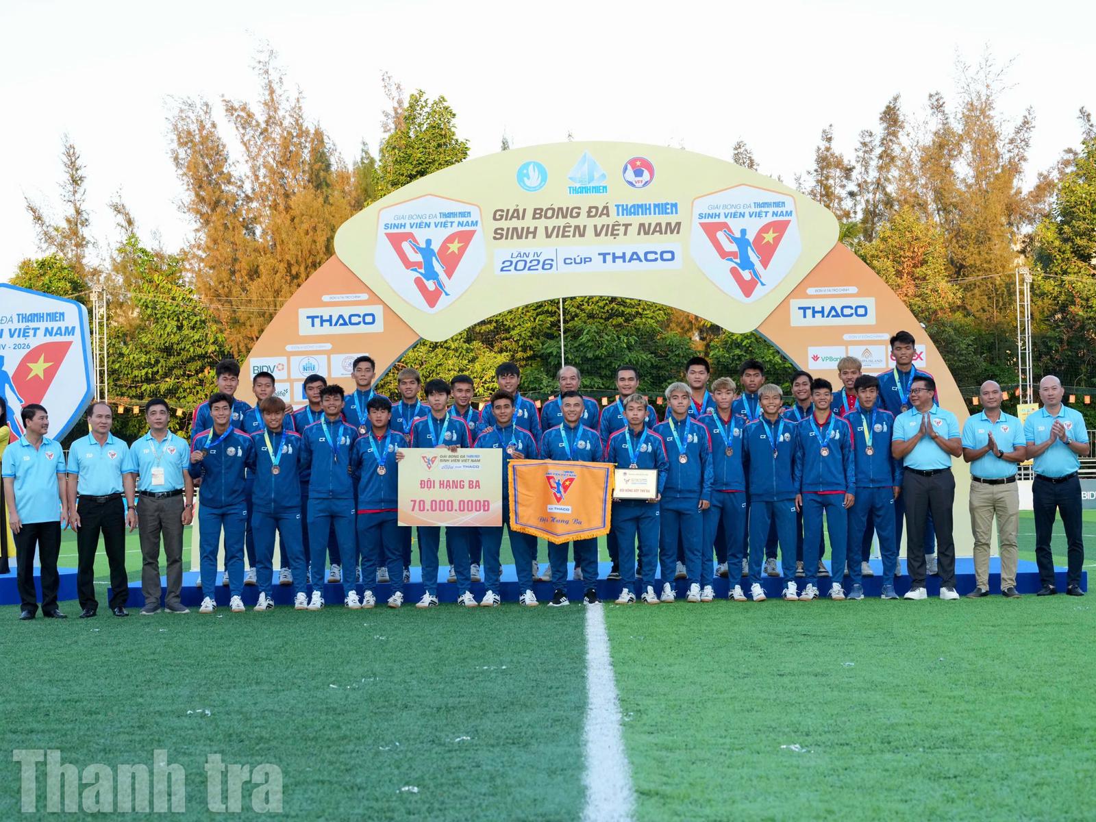 Chiều 22/3, tại sân bóng Trường Đại học Nha Trang, Giải bóng đá Thanh niên Sinh viên Việt Nam lần thứ IV - 2026 Cúp THACO đã khép lại bằng trận chung kết sôi động và lễ bế mạc trang trọng, đánh dấu hai tuần tranh tài hấp dẫn của 12 đội bóng sinh viên đến từ nhiều trường đại học trên cả nước.Trận đấu cuối cùng là màn so tài giữa Trường Đại học Thủy lợi và Trường Đại học Công nghiệp TP.HCM. Trong bầu không khí cổ vũ cuồng nhiệt của đông đảo sinh viên, khán giả, đội bóng Trường Đại học Thủy lợi đã thể hiện sức mạnh vượt trội, giành chiến thắng đậm 4-0 để lên ngôi vô địch một cách thuyết phục. Á quân thuộc về Trường Đại học Công nghiệp TP.HCM; hai đội đồng hạng ba là Trường Đại học Công nghệ TP.HCM và Trường Đại học Công nghệ Đồng Nai.