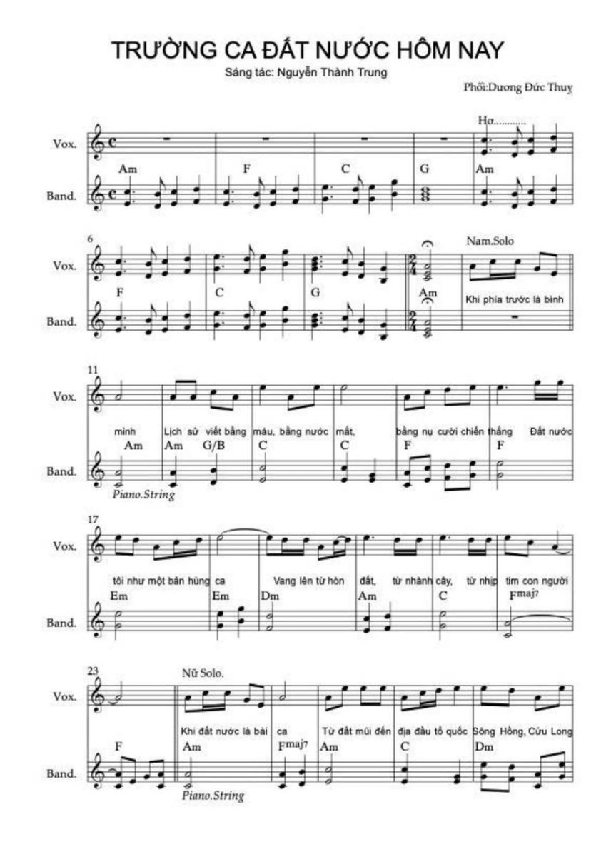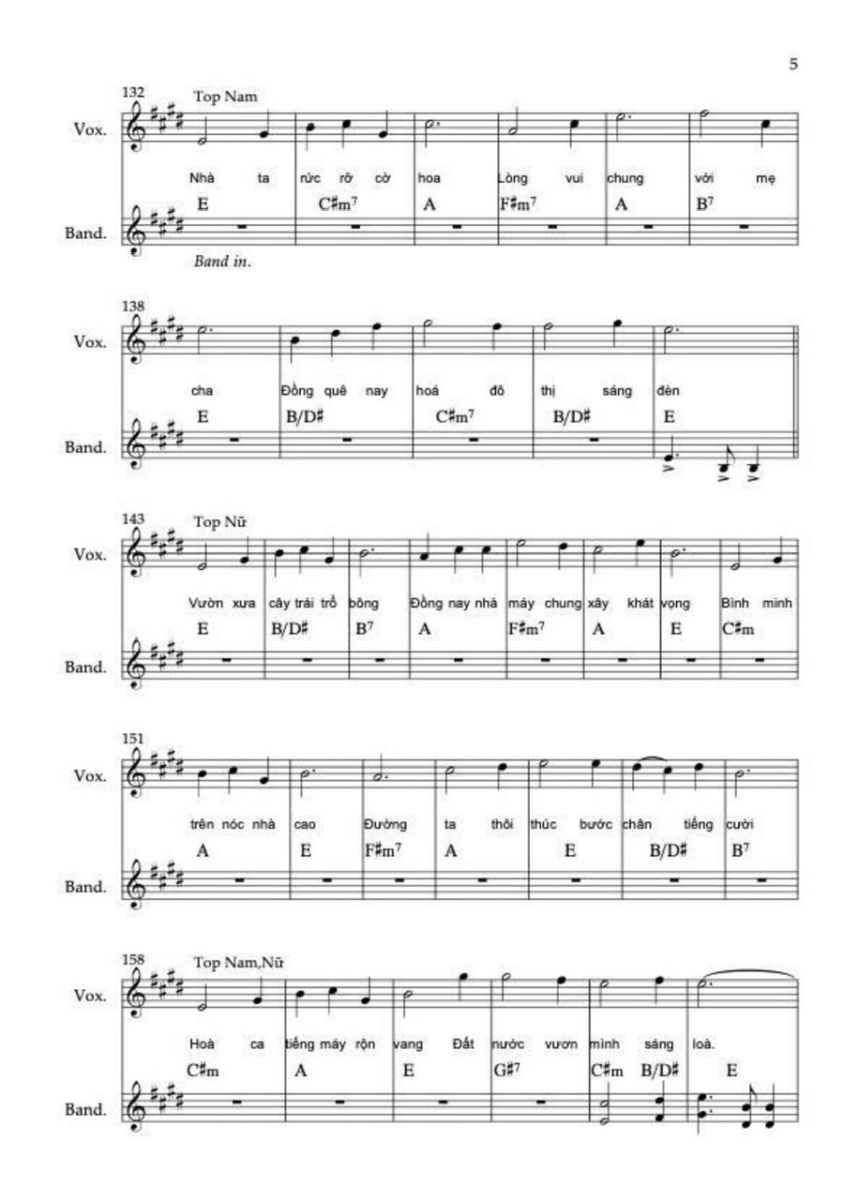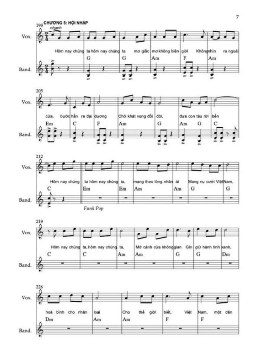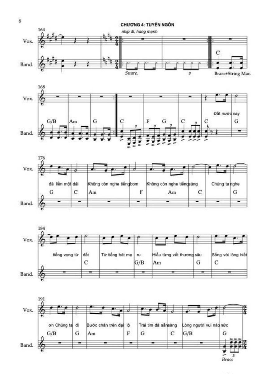 Chương này sử dụng hợp âm chủ đạo C, C6, F/C, G/C. Sử dụng thêm maj6 vì nó không căng như maj7, không mơ hồ như add9, rất phù hợp với “ước mơ được sống”. Điều cực kỳ quan trọng là ở “Việt Nam muôn năm” không add9, không sus, không màu treo mà chỉ còn hợp âm đầy, trường độ dài, tất cả các nốt trong cùng hợp âm rộng vang lên. Lời thề không được có dấu hỏi hòa âm.