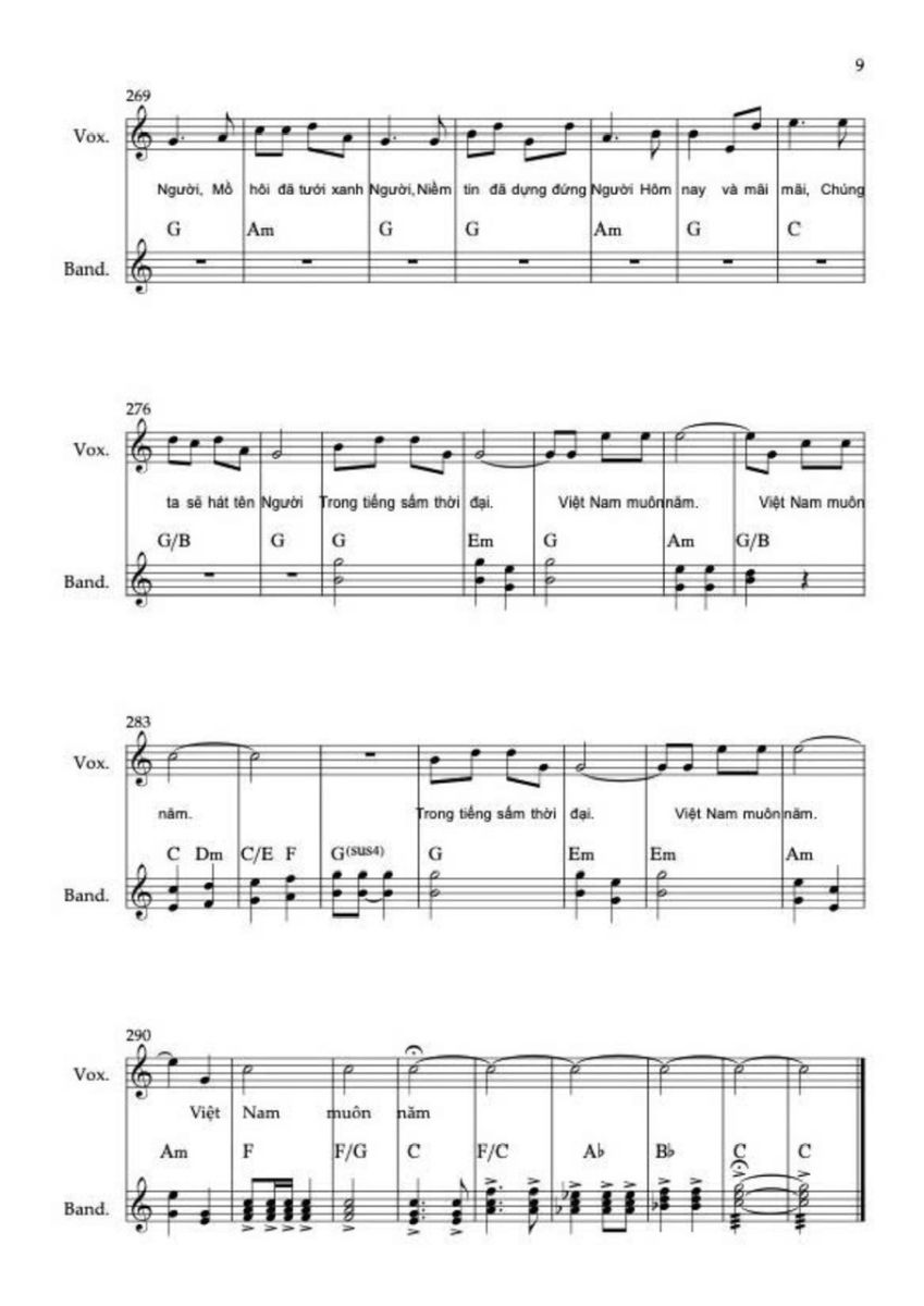 Ở “Việt Nam muôn năm”, không còn dịch bậc, mở âm vực, hay nhịp biến đổi. Âm nhạc lúc này ngừng chuyển động, đúng nghĩa nghi lễ, không thuyết phục nữa, mà được tin, kết tuyệt đối như nghi lễ trang nghiêm.