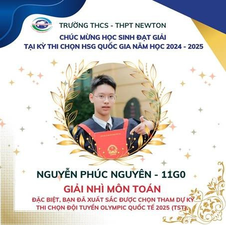 Với thành tích xuất sắc giành Huy chương Vàng Olympic Toán học quốc tế Turkmenistan 2025, em Nguyễn Phúc Nguyên, học sinh Trường THCS – THPT Newton (Hà Nội), đã vinh dự được Bộ trưởng Bộ GD&ĐT trao Bằng khen tại Lễ tuyên dương các tập thể, cá nhân đạt thành tích cao trong các kỳ thi Olympic và Khoa học kỹ thuật quốc tế năm 2025.