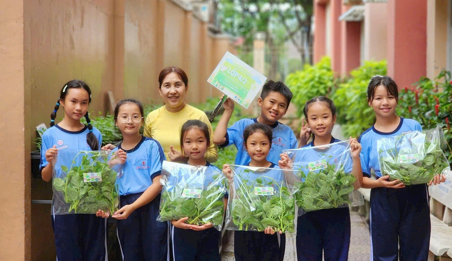 Học sinh Trường Tiểu học Đặng Trần Côn (phường Vĩnh Hội) thu hoạch rau tại trường. Ảnh: TH