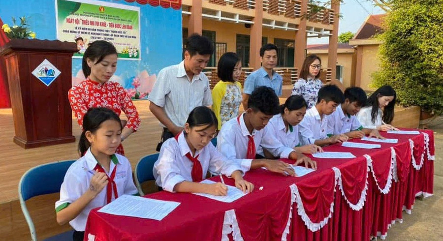 Học sinh Trường PT DTNT THCS & THPT Đắk Glong ký cam kết không sử dụng thuốc lá.