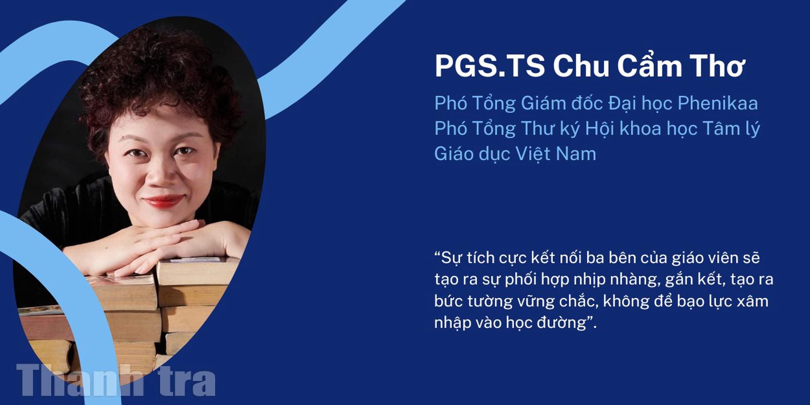 PGS.TS Chu Cẩm Thơ cho rằng, giáo viên giữ vai trò trung tâm và then chốt trong nỗ lực phòng, chống bạo lực học đường. Giáo viên là người tiếp xúc trực tiếp, thường xuyên nhất với học sinh ở trường học. Điều này cho phép họ có thể quan sát, nhận diện sớm các dấu hiệu bất thường – dù là hành vi bắt nạt (người gây bạo lực) hay những thay đổi tâm lý, cảm xúc (người bị bạo lực). Để giúp giáo viên làm tốt nhiệm vụ này, cần tôn trọng họ, cần trao cho họ quyền, trách nhiệm và điều kiện để thực hiện.
