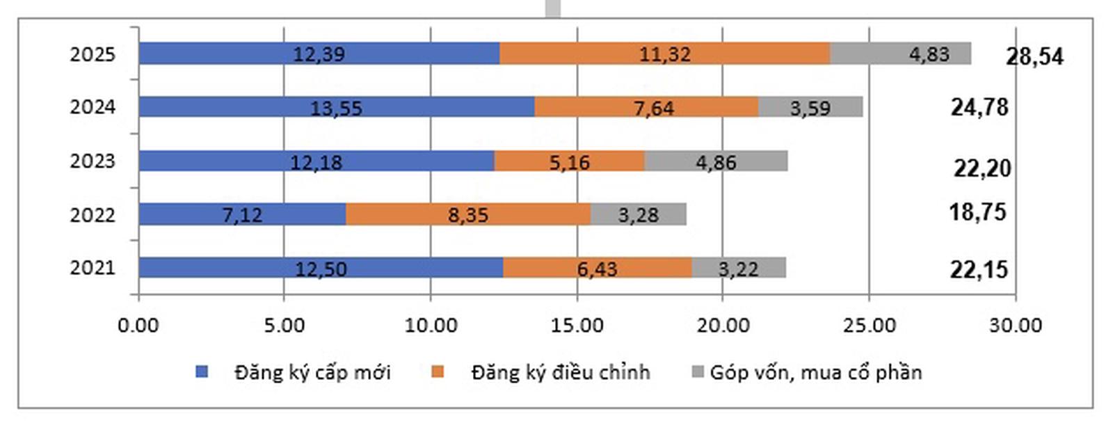 Theo bà Hương, tổng vốn FDI đăng ký vào Việt Nam tính đến ngày 30/9/2025 bao gồm vốn đăng ký cấp mới, vốn đăng ký điều chỉnh và giá trị góp vốn, mua cổ phần của nhà đầu tư nước ngoài đạt 28,54 tỷ USD, tăng 15,2% so với cùng kỳ năm trước.