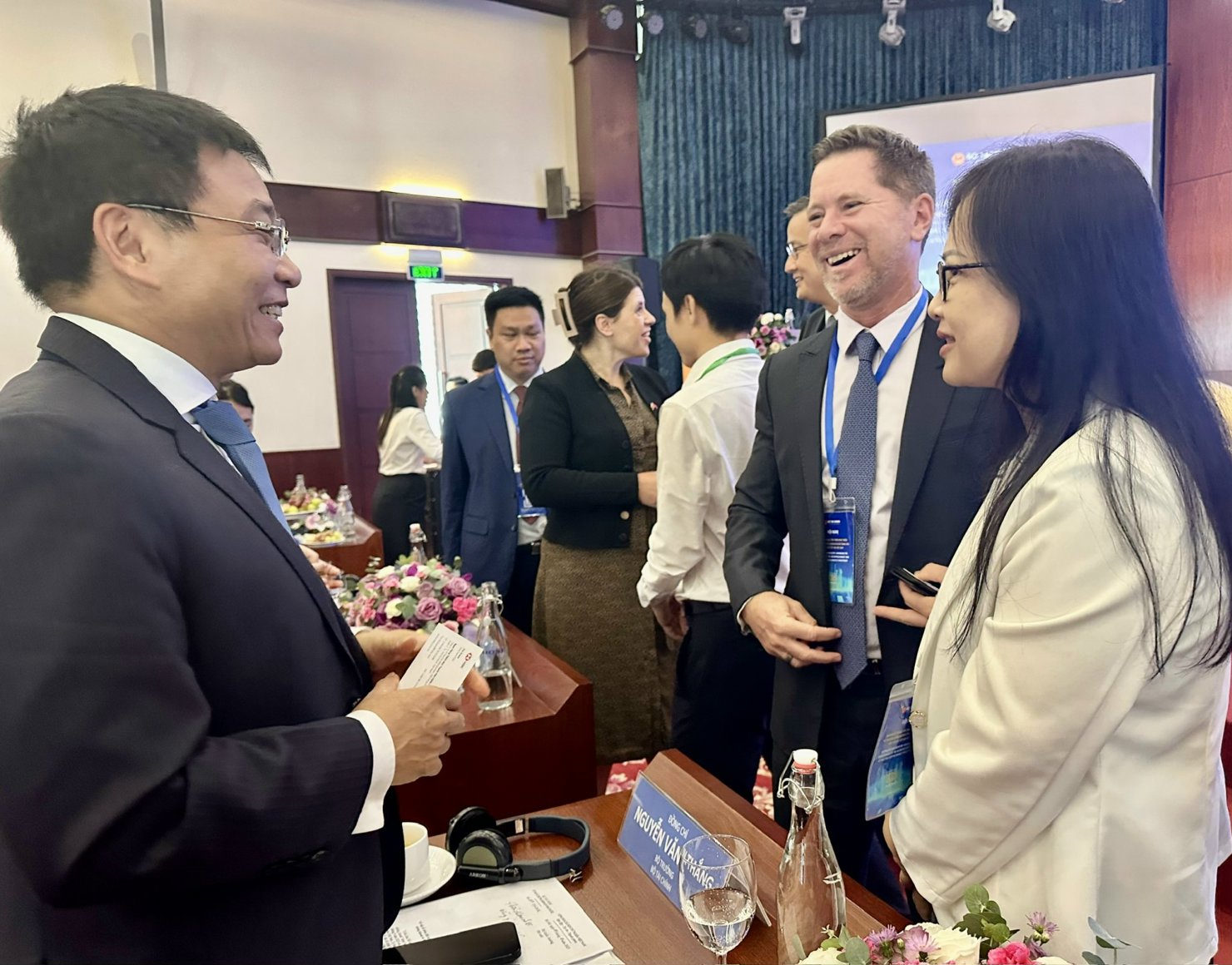 Bộ trưởng Nguyễn Văn Thắng trao đổi với nhà đầu tư bên lề hội nghị. Ảnh: T.H
