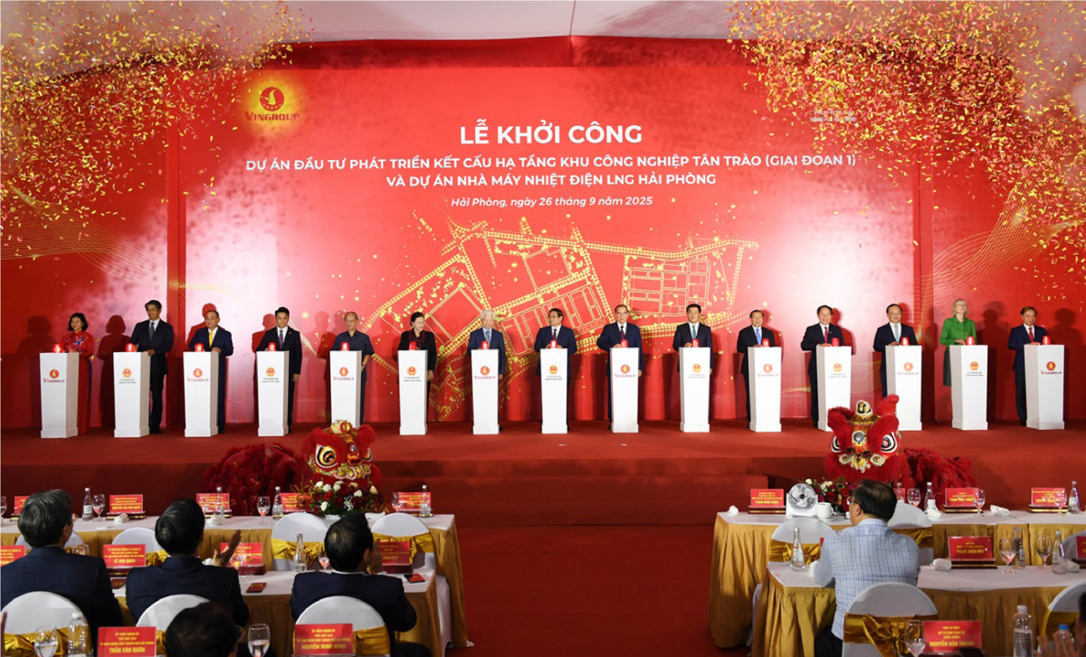 | Ngày 26/09/2025 - Tập đoàn Vingroup chính thức khởi công Dự án đầu tư phát triển kết cấu hạ tầng Khu Công nghiệp Tân Trào (giai đoạn 1) cùng dự án Nhà máy Nhiệt điện LNG Hải Phòng có công suất lớn nhất Việt Nam và hàng đầu thế giới. |