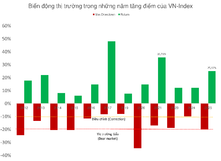 Nhưng con đường tới đỉnh không hề phẳng. Tháng 4-2025, thị trường gặp "cú sốc thuế quan" khiến VN-Index lao dốc. Mức giảm tối đa (Maximum drawdown) khi đó vượt 20% - nghĩa là nếu mua ở vùng đỉnh trước đó, giá trị danh mục của nhà đầu tư có thể tạm thời mất hơn 1/5 chỉ trong thời gian ngắn.