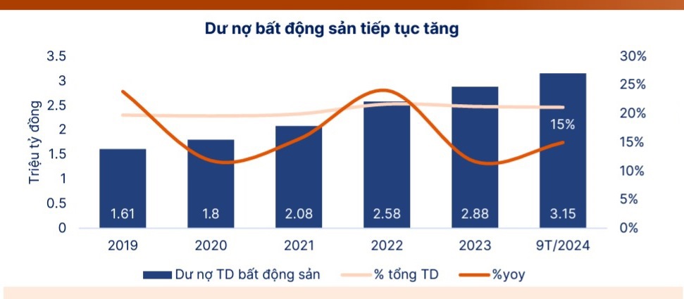 Mảng bất động sản tiêu dùng (còn gọi là cá nhân vay mua nhà, sửa nhà), trong 9 tháng năm 2024 ghi nhận 1,8 triệu tỷ đồng, tăng 7,2% so với cùng kỳ năm 2023 và tăng 4,6% so với đầu năm 2024. Mảng cho vay chủ đầu tư liên tục tăng tỷ trọng trong 2 năm gần đây, đạt 1,3 triệu tỷ đồng, tăng 28,2% so với đầu cùng kỳ năm trước và tăng 16% so với đầu năm 2024.