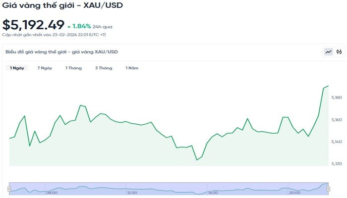 Giá vàng trong nước (24/2) tăng mạnh trở lại 3,6 triệu đồng, lên mức 184,6 triệu đồng/lượng; vàng thế giới tăng vọt lên mức 5.192 USD/ounce.