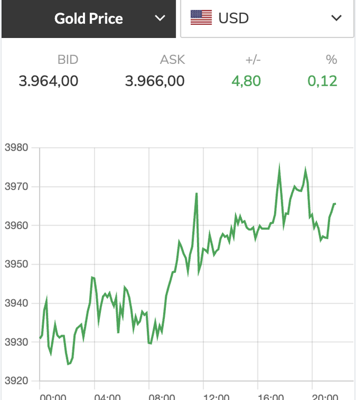 Lúc 10h30 sáng nay, 7-10, giá vàng thế giới đã tăng lên mức 3.966 USD/ounce. Quy đổi theo tỉ giá niêm yết tại ngân hàng, giá vàng thế giới tương đương 126,2 triệu đồng/lượng.