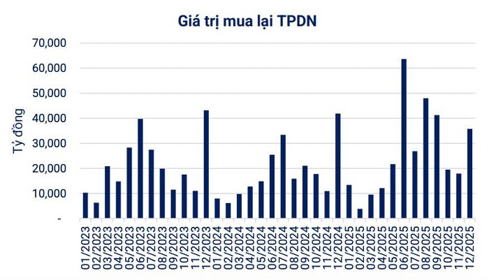 Trên thị trường thứ cấp, tổng giá trị giao dịch TPDN riêng lẻ trong tháng 12/2025 đạt 176.770 tỷ đồng, tương ứng bình quân 7.686 tỷ đồng mỗi phiên, tăng 39% so với mức bình quân của tháng 11.