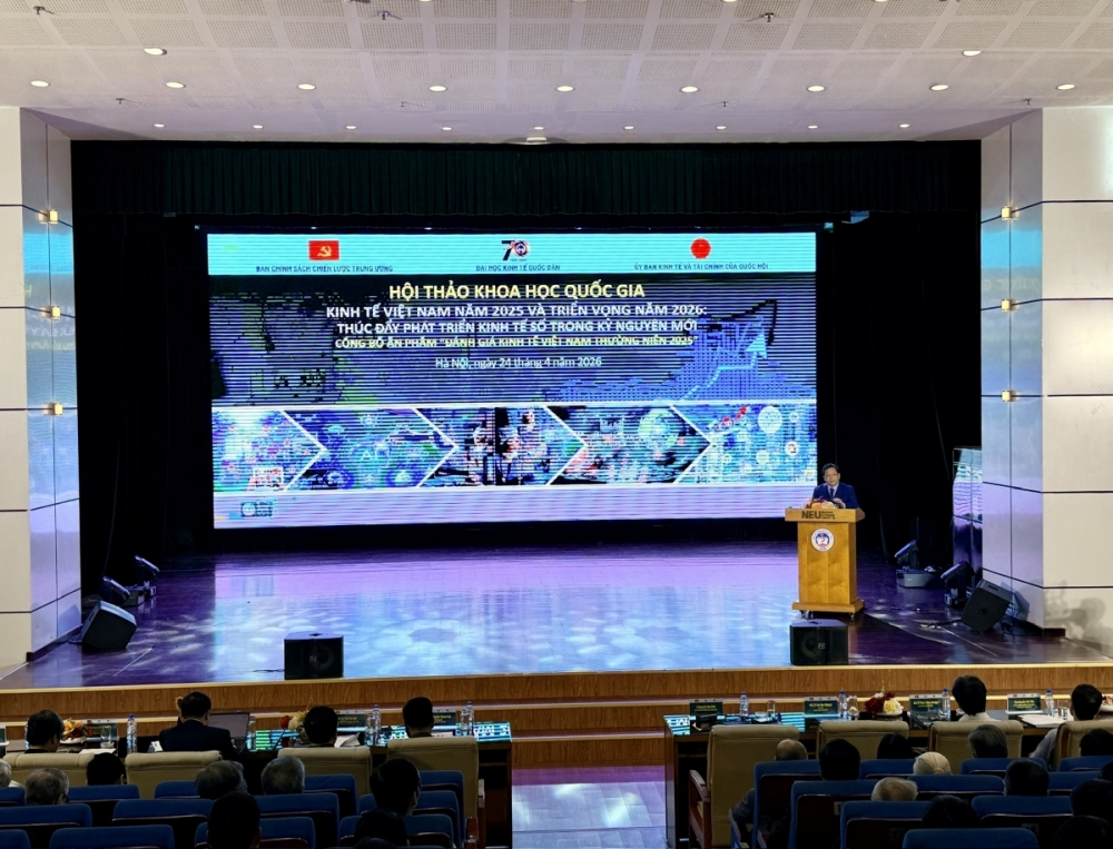 Ngày 24/4/2026, Đại học Kinh tế Quốc dân phối hợp cùng Ban Chính sách, chiến lược Trung ương; Ủy ban Kinh tế và Tài chính của Quốc hội tổ chức Hội thảo Khoa học Quốc gia để đánh giá kinh tế Việt Nam năm 2025 và triển vọng năm 2026, đồng thời công bố Ấn phẩm Đánh giá Kinh tế Việt Nam thường niên 2025 của Đại học Kinh tế Quốc dân. Chủ đề của Hội thảo cũng như của Ấn phẩm thường niên năm nay là “Đánh giá kinh tế Việt Nam thường niên 2025 - Thúc đẩy phát triển kinh tế số trong kỷ nguyên mới”.