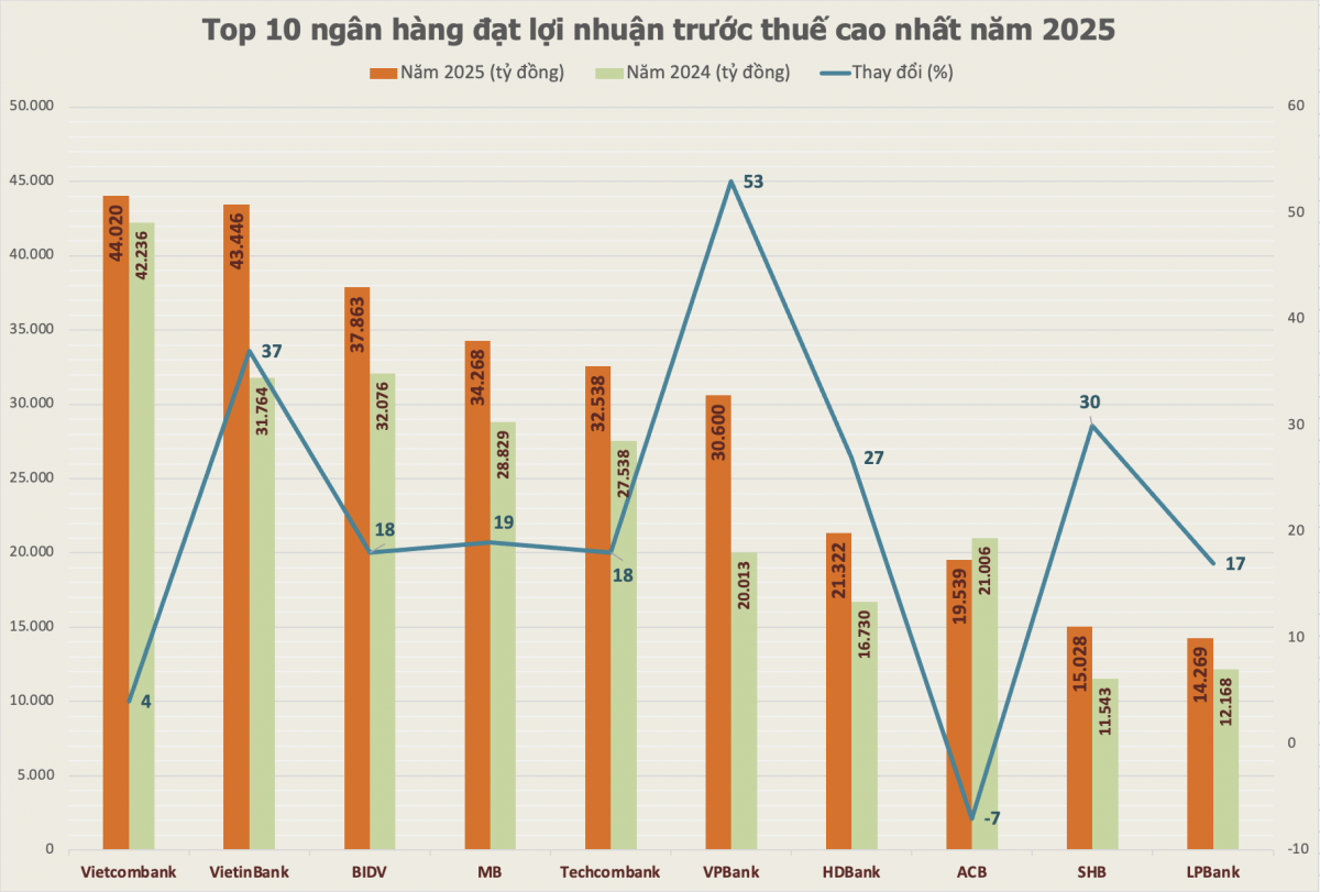 Ngay sau nhóm quốc doanh, MB nổi lên là ngân hàng TMCP có lợi nhuận trước thuế cao nhất hệ thống, đạt 34.268 tỷ đồng, giữ vững vị trí thứ tư, tăng gần 19% so với năm 2024. Techcombank đứng thứ 5 với lợi nhuận trước thuế 32.538 tỷ đồng, tăng 18% so với năm trước. VPBank vươn lên vị trí thứ 6 với lợi nhuận 30.600 tỷ đồng, tăng mạnh 53% so với năm 2024.