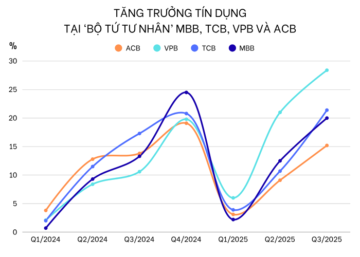 Theo báo cáo tài chính hợp nhất quý III/2025 đã công bố, ACB ghi nhận tăng trưởng tín dụng 9 tháng đầu năm 2025 ở mức 15,2% so với đầu năm, thấp hơn 3 nhà băng còn lại trong nhóm "bộ tứ" nhưng phù hợp với chiến lược mở rộng bền vững của ngân hàng trong bối cảnh mảng tín dụng bán lẻ chưa thực sự khởi sắc và động lực tăng trưởng dư nợ còn chủ yếu phụ thuộc vào cho vay doanh nghiệp.