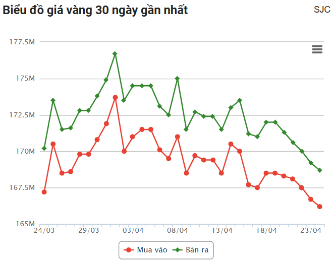 Công ty Vàng bạc đá quý Sài Gòn (SJC), DOJI, Bảo Tín Minh Châu, Phú Quý đồng loạt niêm yết giá vàng miếng SJC mua vào-bán ra ở mức 166,2-168,7 triệu đồng/lượng, giảm 500.000 đồng chiều mua và chiều bán so với chốt phiên hôm qua (ngày 23/4).