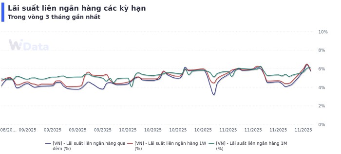 Trong tuần, lãi suất qua đêm neo cao, bắt đầu từ mốc 5,76% vào đầu tuần và tăng vọt lên 6,44% trong phiên 25/11, trước khi giảm dần về mức 5,74% tại phiên 26/11.