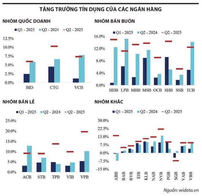Tính đến hết quý II/2025, tăng trưởng tín dụng giữa các nhóm ngân hàng khá đồng đều, trái ngược với sự phân hóa trong quý đầu năm cũng như cùng kỳ các năm về trước. Trong đó, nhóm ngân hàng TMCP tiếp tục thể hiện vai trò dẫn dắt đà tăng trưởng tín dụng toàn ngành trong nửa đầu năm.