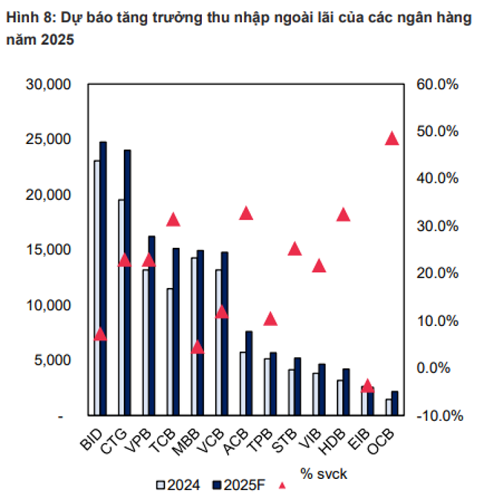 Thu nhập lãi thuần được dự báo tăng gần 10% trong năm nay, trong khi thu nhập ngoài lãi dự kiến sẽ tăng 32,9% svck trong năm 2025, với động lực từ thu nhập phí tăng (+27,9% svck) và thu nhập từ thu hồi nợ xấu tăng gấp đôi.