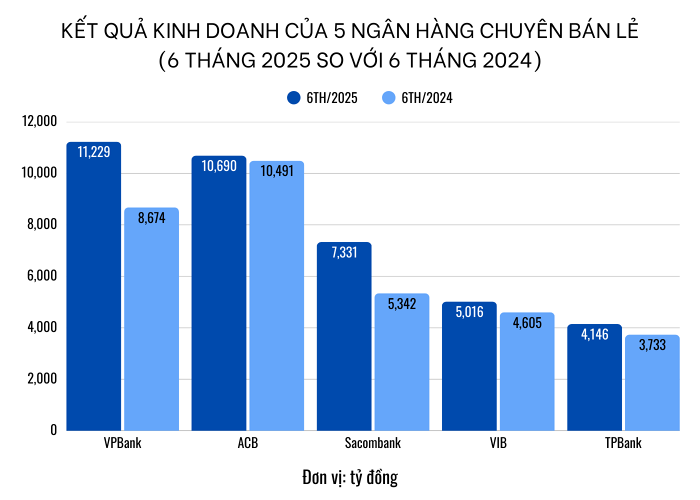 Tăng trưởng tín dụng bán niên tích cực đã phản ánh phần nào vào kết quả kinh doanh của các ngân hàng bán lẻ: VPBank và ACB nằm trong top 5 ngân hàng tư nhân cán mốc lợi nhuận chục nghìn tỷ sau 6 tháng, trong khi Sacombank đạt tăng trưởng lợi nhuận 37% với động lực chính là thu nhập lãi thuần. TPBank và VIB lần lượt đạt tăng trưởng lợi nhuận trước thuế 11% và 9%.