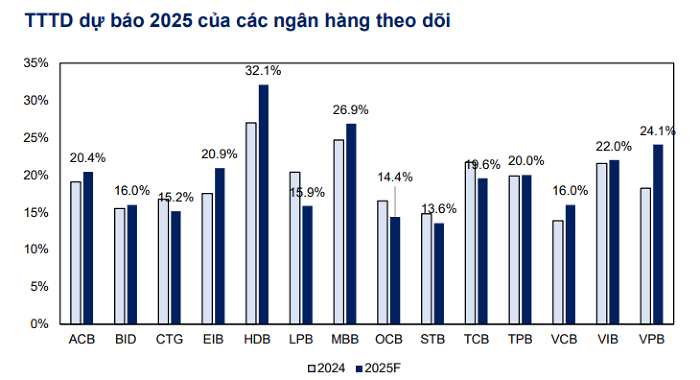 Tại TPBank, tăng trưởng tín dụng dự kiến đạt 19% svck trong năm 2025, một phần chiến lược tập trung vào phân khúc khách hàng đại chúng có thu nhập khá, thế hệ Y–Z và hộ kinh doanh – những nhóm có thu nhập tăng nhanh. Tăng trưởng tín dụng cao sẽ giúp thu nhập lãi thuần dự kiến tăng 15,7% svck. Thu nhập ngoài lãi cũng được dự báo tăng mạnh 19,7% svck, hưởng lợi từ lợi thế cạnh tranh trong nền tảng ngân hàng số.
