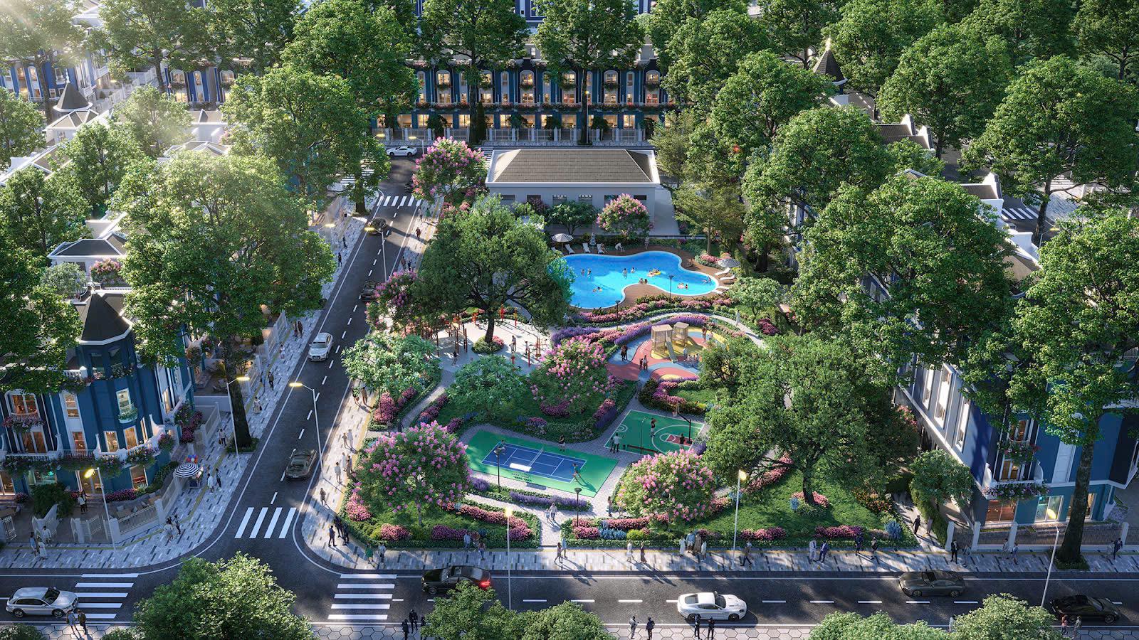Khu đô thị được bao phủ bởi hệ thống cây cao to tán rộng che bóng mát, vườn hoa và thảm thực vật đa tầng, tạo nên cảnh quan sinh thái hài hòa, mang đến không gian sống trong lành, dễ chịu – nơi con người có thể cảm nhận rõ rệt sự cân bằng giữa hiện đại và thiên nhiên.