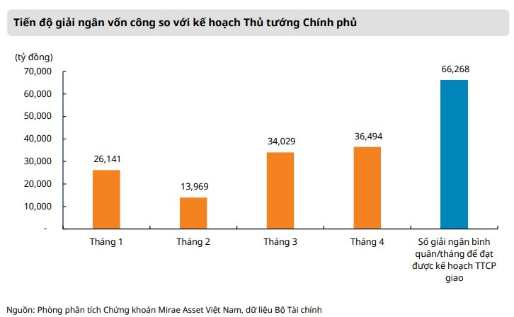 Đặc biệt, đầu tư công là động lực tăng trưởng quan trọng trong các tháng còn lại của năm 2023, nhưng cần tăng tốc trong tiến độ giải ngân. Để đạt được từ 95% đến 100% kế hoạch Thủ tướng giao, Mirae Asset ước tính bình quân 9 tháng còn lại phải giải ngân mỗi tháng ít nhất từ 62 đến 66 nghìn tỷ đồng (gấp gần 2 lần so với mức giải ngân bình quân của tháng 3 và tháng 4). Nếu đạt được, thậm chí số vốn giải ngân đầu tư công năm nay có thể tăng đến 18,8 – 25% so với cùng kỳ.