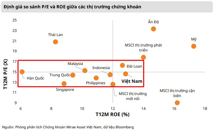 Đáng lưu ý sau một quá trình hồi phục, hiện tại P/E của Việt Nam ghi nhận 14,6 lần, ngang bằng với nhiều thị trường khác như Trung Quốc (SHCOMP: 14,4x), Indonesia (JCI: 14,5x), Hàn Quốc (KOSPI: 15x), Malaysia (FBMKLCI: 15,3x) và cao hơn nhiều so với chỉ số tham chiếu MSCI các thị trường cận biên (9,x lần), thị trường mới nổi (12,6x lần).