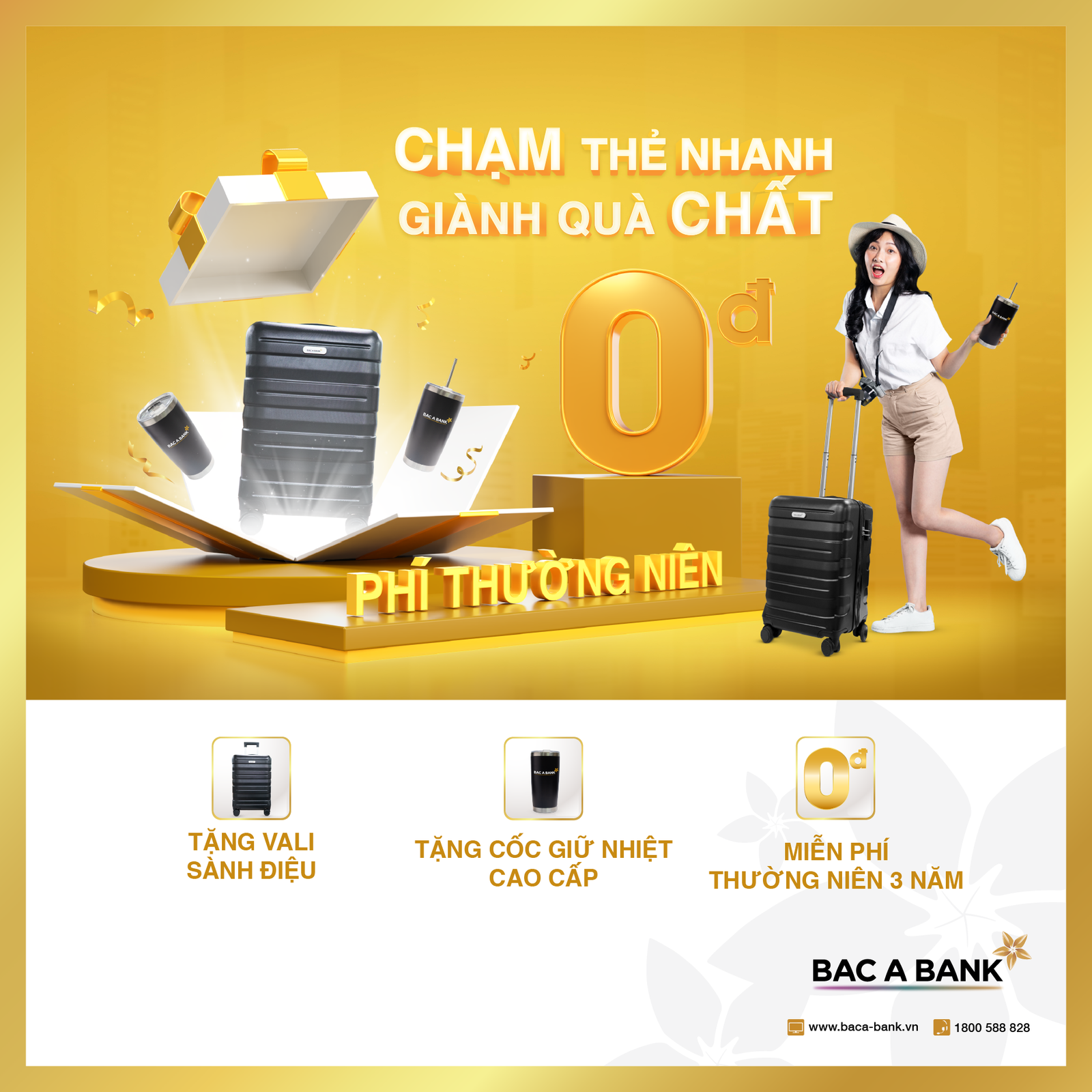 Trong thời gian từ 15/09 đến hết 15/12/2025, khách hàng tham gia chương trình ưu đãi “Chạm thẻ nhanh - Giành quà chất” của Ngân hàng TMCP Bắc Á (BAC A BANK) sẽ có cơ hội nhận được những món quà hấp dẫn. Cụ thể, khi khách hàng mở mới thẻ tín dụng quốc tế BAC A BANK MasterCard (gồm cả hai dòng thẻ hiện hữu là thẻ Rewards Gold và thẻ Cashback Platinum), kích hoạt và chi tiêu đạt điều kiện của Chương trình trong tháng đầu tiên sẽ vừa được miễn phí thường niên lên đến 03 năm, vừa được nhận một trong hai món quà sành điệu. Theo như công bố của Ngân hàng, vali tiện lợi 20 inch sẽ được trao cho khách hàng đạt mức chi tiêu từ 8 triệu đồng sớm nhất trong vòng 30 ngày kể từ ngày phát hành thẻ, trong khi cốc giữ nhiệt cao cấp 500ml sẽ thuộc về khách hàng chi tiêu đạt 1 triệu đồng trong cùng khoảng thời gian.