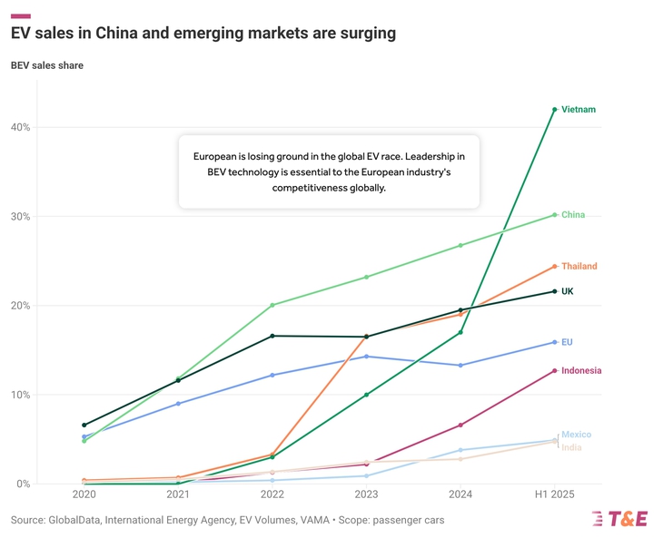 Báo cáo mới nhất của Liên đoàn Giao thông và Môi trường châu Âu (T&E) đã tiết lộ những con số đáng kinh ngạc. Trong nửa đầu năm 2025, Việt Nam đạt tỉ lệ xe điện bán ra lên đến 42%, vượt qua cả Trung Quốc (30,2% xe điện). Thái Lan cũng ghi nhận mức tăng trưởng ấn tượng với 24,4% thị phần xe điện.