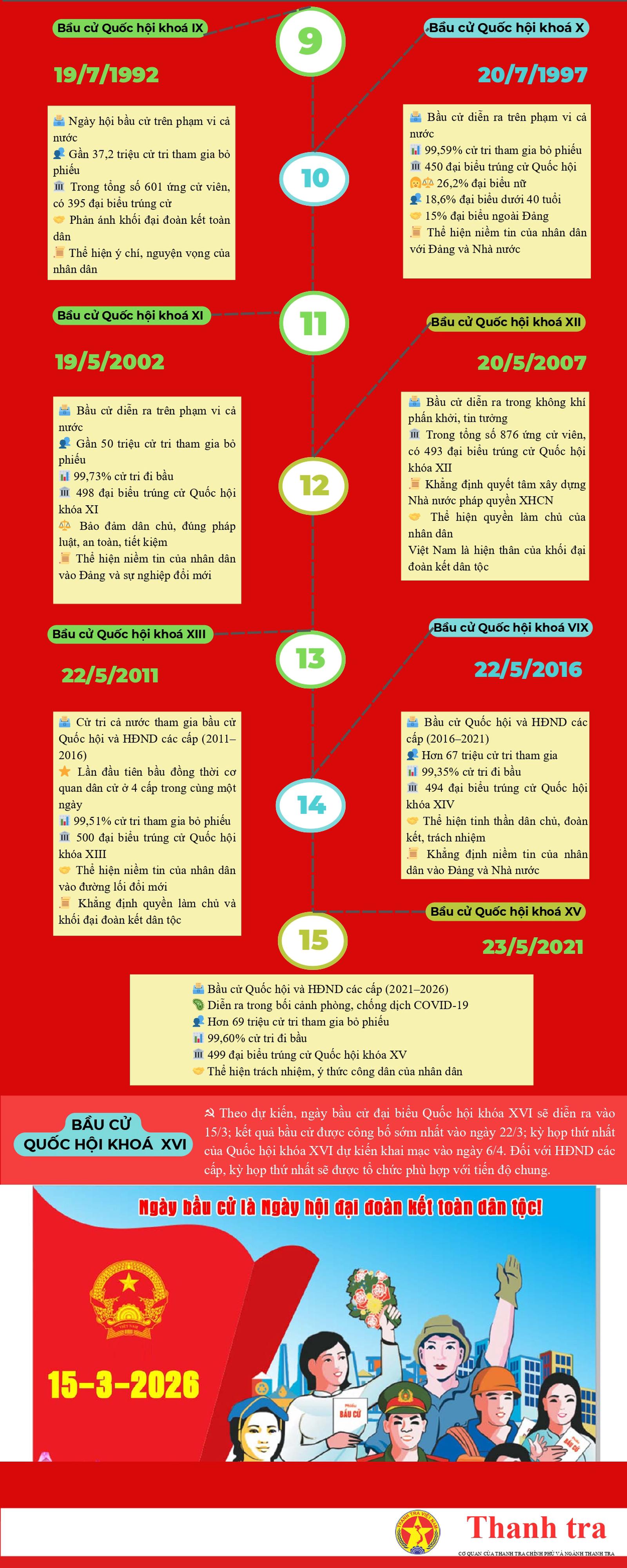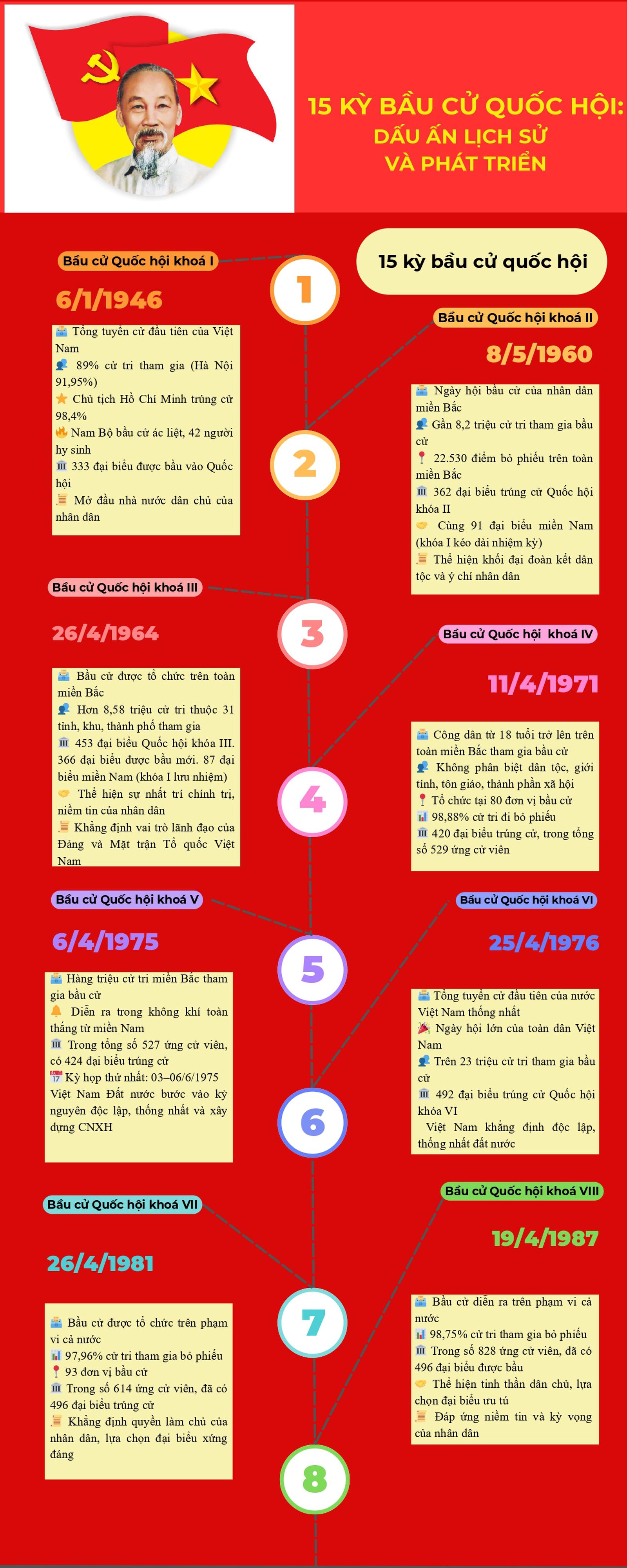 Trải qua 15 cuộc bầu cử Quốc hội cho thấy: Mỗi cuộc bầu cử diễn ra trong những bối cảnh lịch sử khác nhau, nhưng đều phản ánh rõ ý chí, nguyện vọng và niềm tin của Nhân dân đối với Đảng, Nhà nước ta. Các cuộc bầu cử đã khẳng định vai trò trung tâm của Quốc hội trong hệ thống chính trị và tiến trình xây dựng Nhà nước pháp quyền xã hội chủ nghĩa Việt Nam.