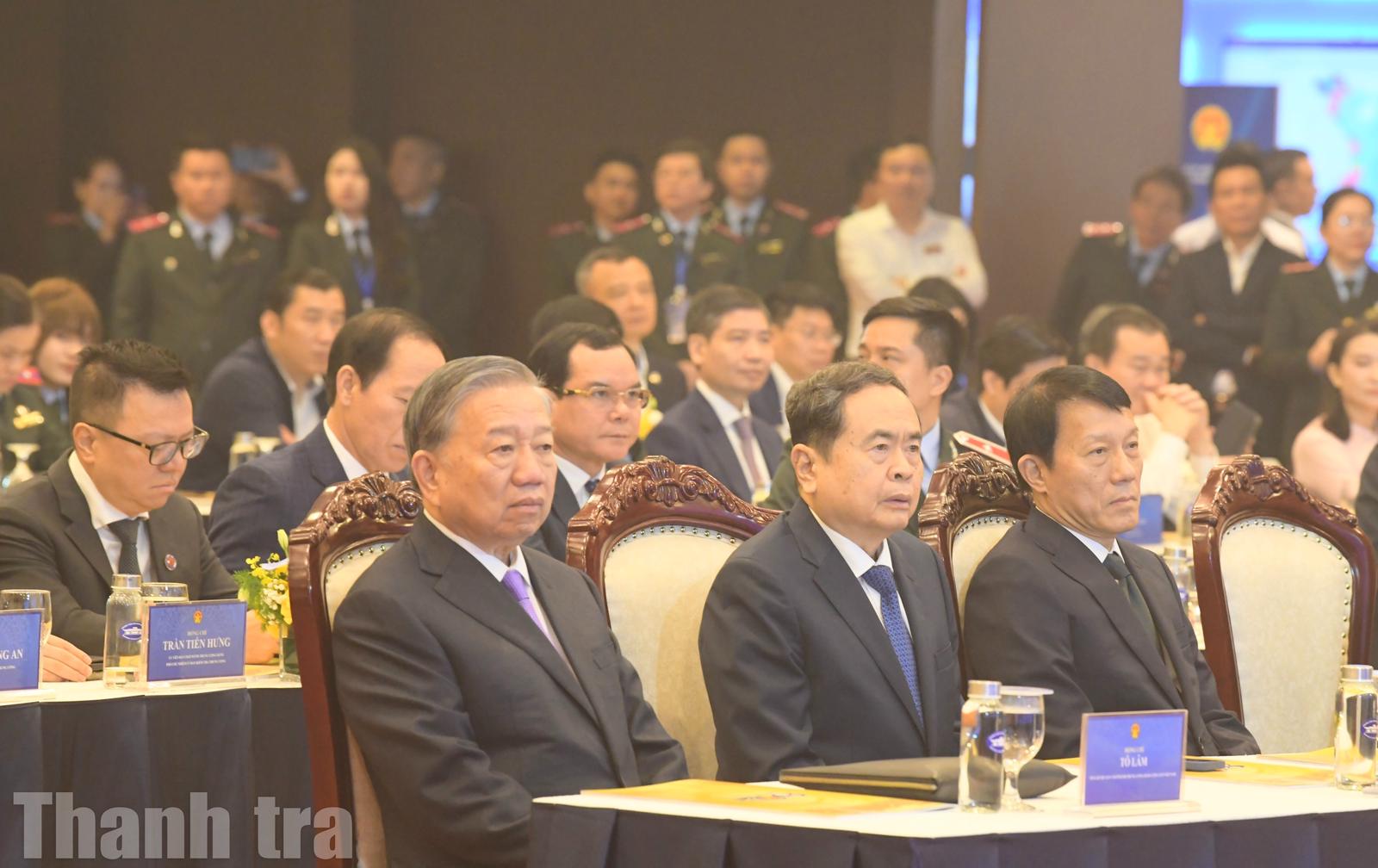 Tổng Bí thư Tô Lâm, Chủ tịch Quốc hội Trần Thanh Mẫn, Bộ trưởng Bộ Công an Lương Tam Quang (từ trái qua phải) dự Lễ kỷ niệm 80 năm Ngày truyền thống Thanh tra Việt Nam. Ảnh: Huy Trần