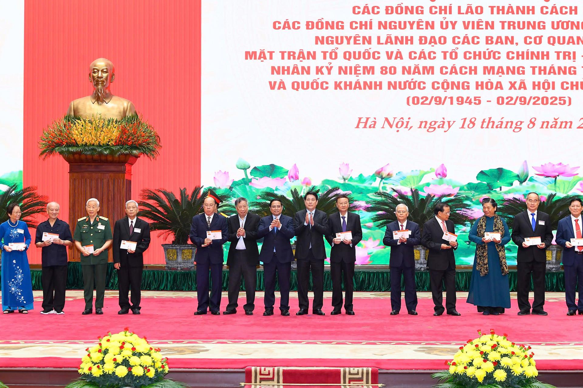Chủ tịch nước Lương Cường và Thủ tướng Phạm Minh Chính trao Thẻ Đảng viên mẫu mới cho các nguyên lãnh đạo Đảng, Nhà nước. Ảnh: Đ.X