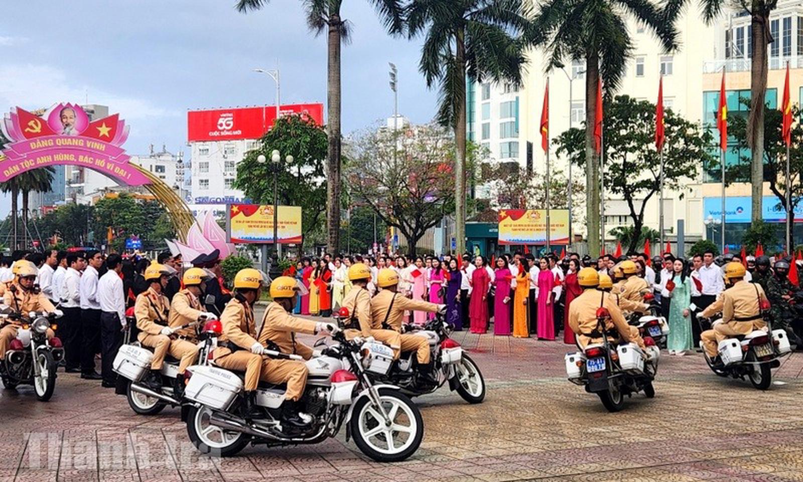 Lễ ra quân mở đợt cao điểm tấn công, trấn áp tội phạm bảo đảm an ninh trật tự tại TP Huế. Ảnh: Minh Tân