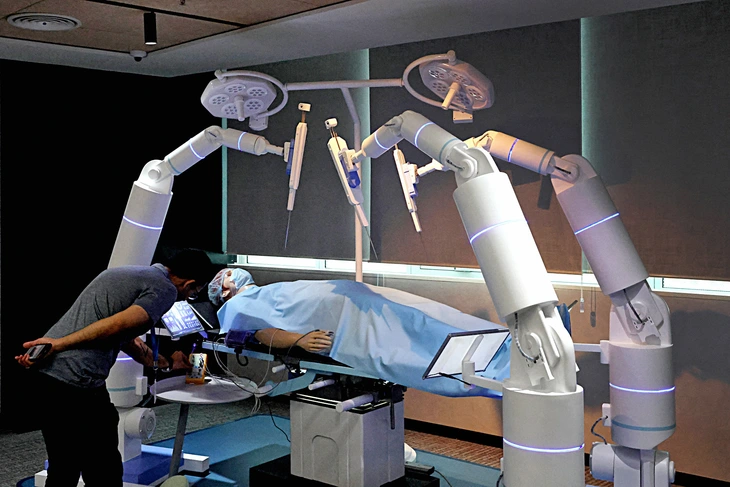 Một người đang kiểm tra mô hình hệ thống phẫu thuật robot bên trong phòng thí nghiệm sáng tạo tại trụ sở Wipro ở thành phố Bengaluru, Ấn Độ, ngày 13-8 - Ảnh: Reuters
