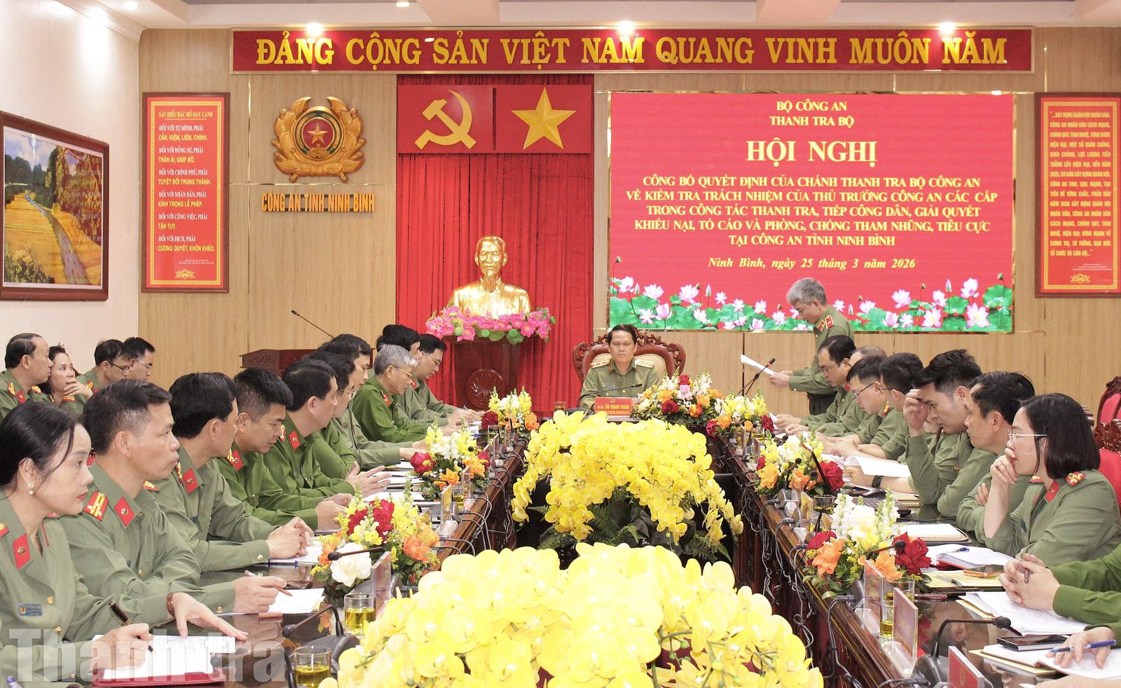 Thanh tra Bộ Công an công bố quyết định kiểm tra trách nhiệm của Thủ trưởng Công an các cấp trong công tác thanh tra, tiếp công dân, giải quyết khiếu nại, tố cáo và phòng, chống tham nhũng, tiêu cực tại Công an tỉnh Ninh Bình (ngày 25/3/2026). Ảnh: Trọng Tài