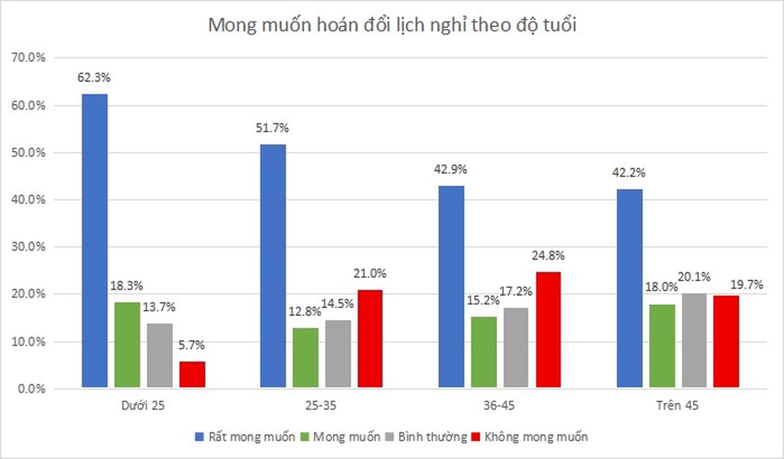 Cụ thể, nhóm dưới 25 tuổi có tỷ lệ “rất mong muốn” cao nhất (62,3%), đồng thời tỷ lệ “không mong muốn” thấp nhất (5,7%), phản ánh xu hướng ưu tiên trải nghiệm, linh hoạt thời gian và nhu cầu nghỉ dài ngày của lực lượng lao động trẻ.