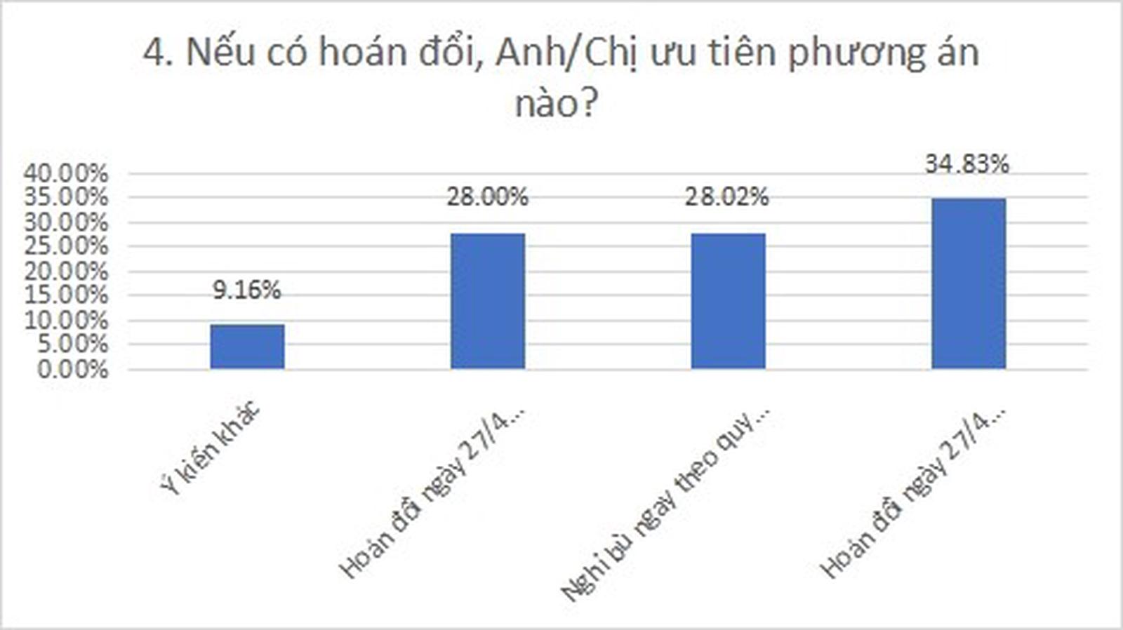 Hai phương án còn lại có tỷ lệ lựa chọn gần tương đương nhau, trong đó 28,02% lựa chọn nghỉ bù theo quy định (không hoán đổi), và 28% lựa chọn hoán đổi ngày 27/4 sang ngày 2/5. Bên cạnh đó, 9,16% ý kiến lựa chọn phương án khác.