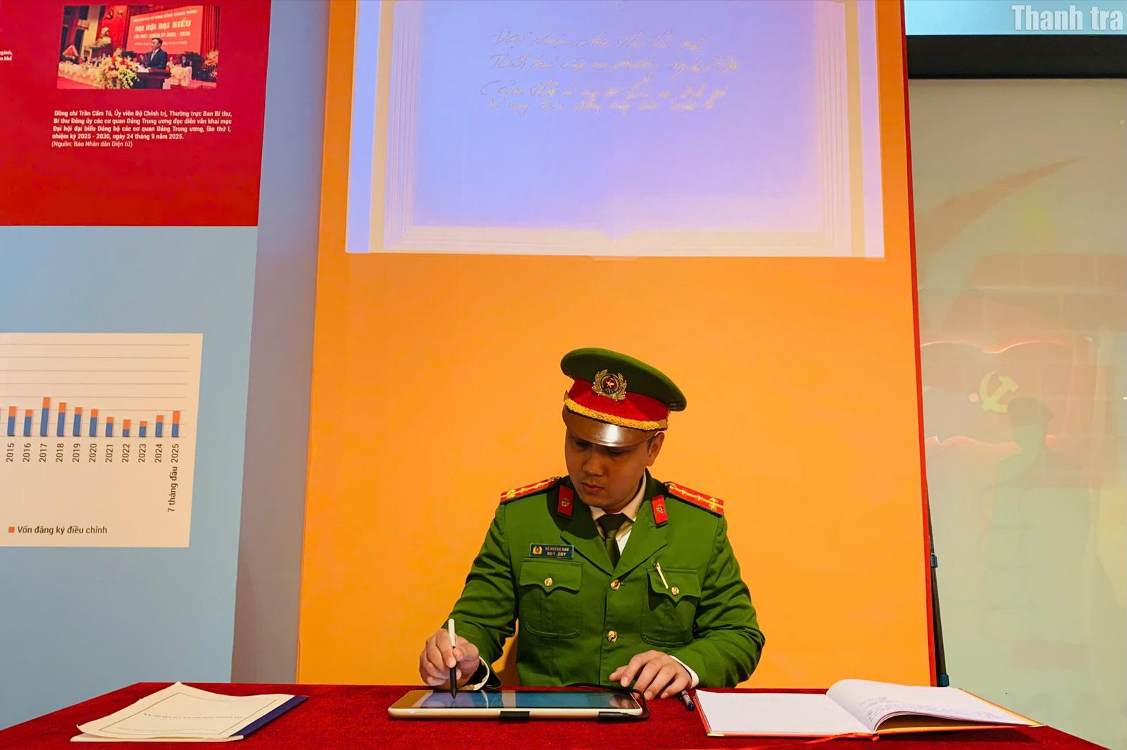 Đại úy Vũ Hoàng Nam, Bí thư Đoàn Thanh niên Công an phường Nghĩa Đô - TP Hà Nội ghi lưu bút tại Triển lãm. Ảnh: PV