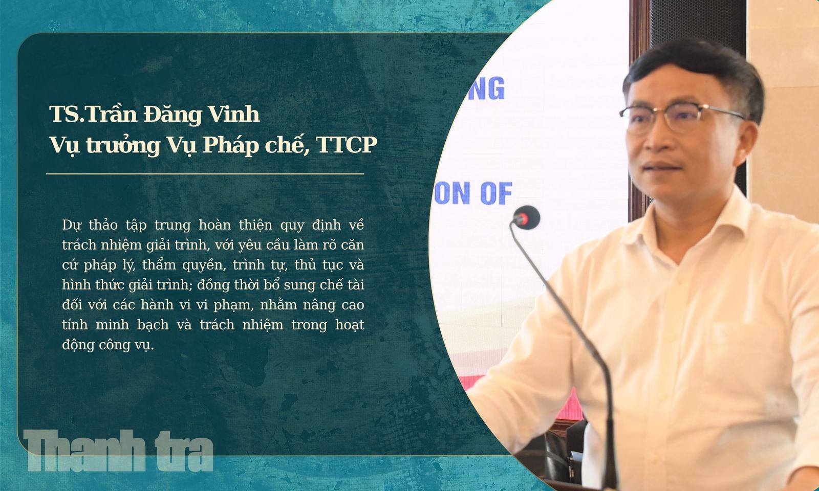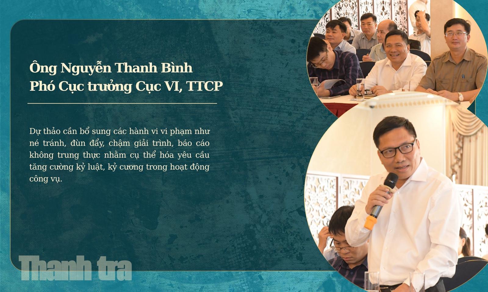 Cũng liên quan đến trách nhiệm giải trình, ông Nguyễn Thanh Bình, Phó Cục trưởng Cục VI (Thanh tra Chính phủ) đề nghị bổ sung rõ các hành vi vi phạm như né tránh, đùn đẩy, chậm giải trình, báo cáo không trung thực nhằm cụ thể hóa yêu cầu tăng cường kỷ luật, kỷ cương trong hoạt động công vụ.