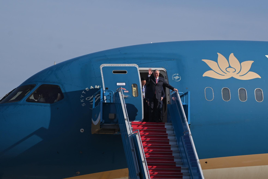 Khoảng 8h, máy bay Boeing 787 của Vietnam Airlines chở Phó Thủ tướng thường trực Nguyễn Hòa Bình cùng lãnh đạo các bộ, ngành từ Hà Nội hạ cánh xuống sân bay Long Thành.