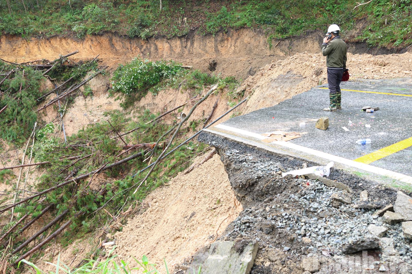 Toàn bộ mặt đường bị đứt gãy hoàn toàn, chiều rộng khoảng 50m, sâu khoảng 30m, chiều dài vệt trượt lên tới 100m, chia cắt tuyến giao thông. oàn bộ kết cấu mặt đường đã bị phá hủy hoàn toàn, tạo thành một hố sâu khổng lồ. Khối lượng lớn đất đá cùng nhiều cây thông bị bật gốc đổ ập xuống phía taluy âm, vùi lấp một phần diện tích đất sản xuất nông nghiệp của người dân.Ảnh: Vũ Linh