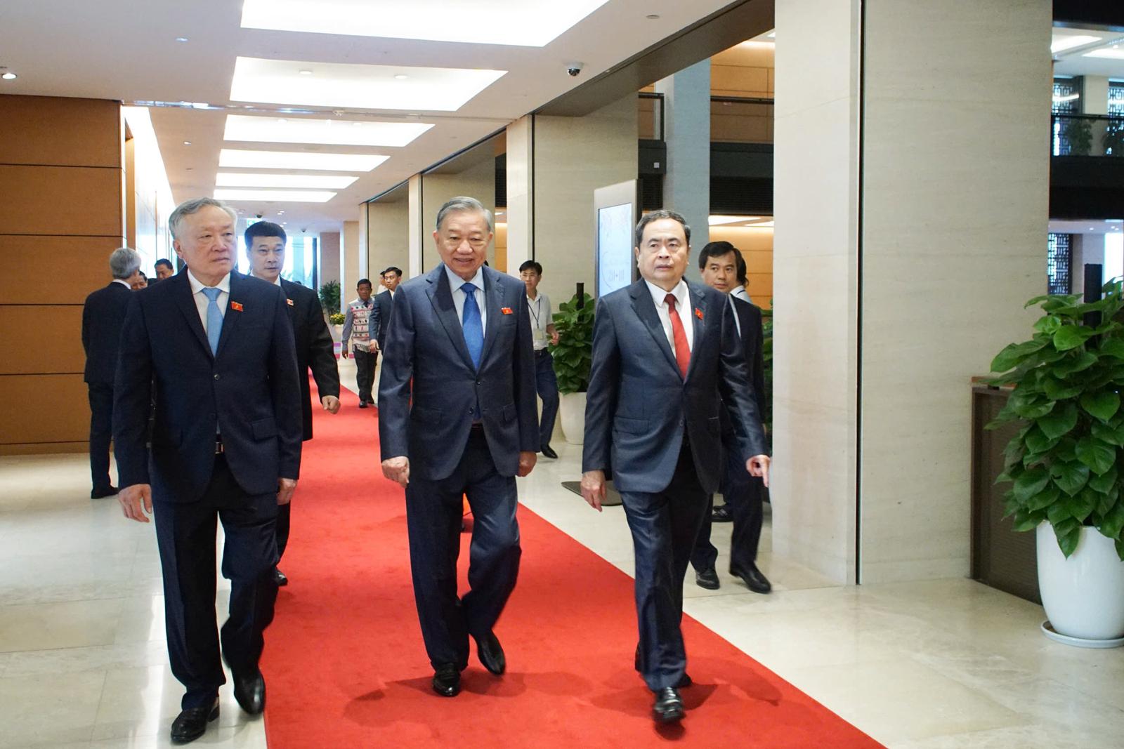 Các lãnh đạo Đảng, Nhà nước, Mặt trận Tổ quốc Việt Nam quay lại Nhà Quốc hội để họp phiên trù bị Kỳ họp thứ 10. Ảnh: P.Thắng
