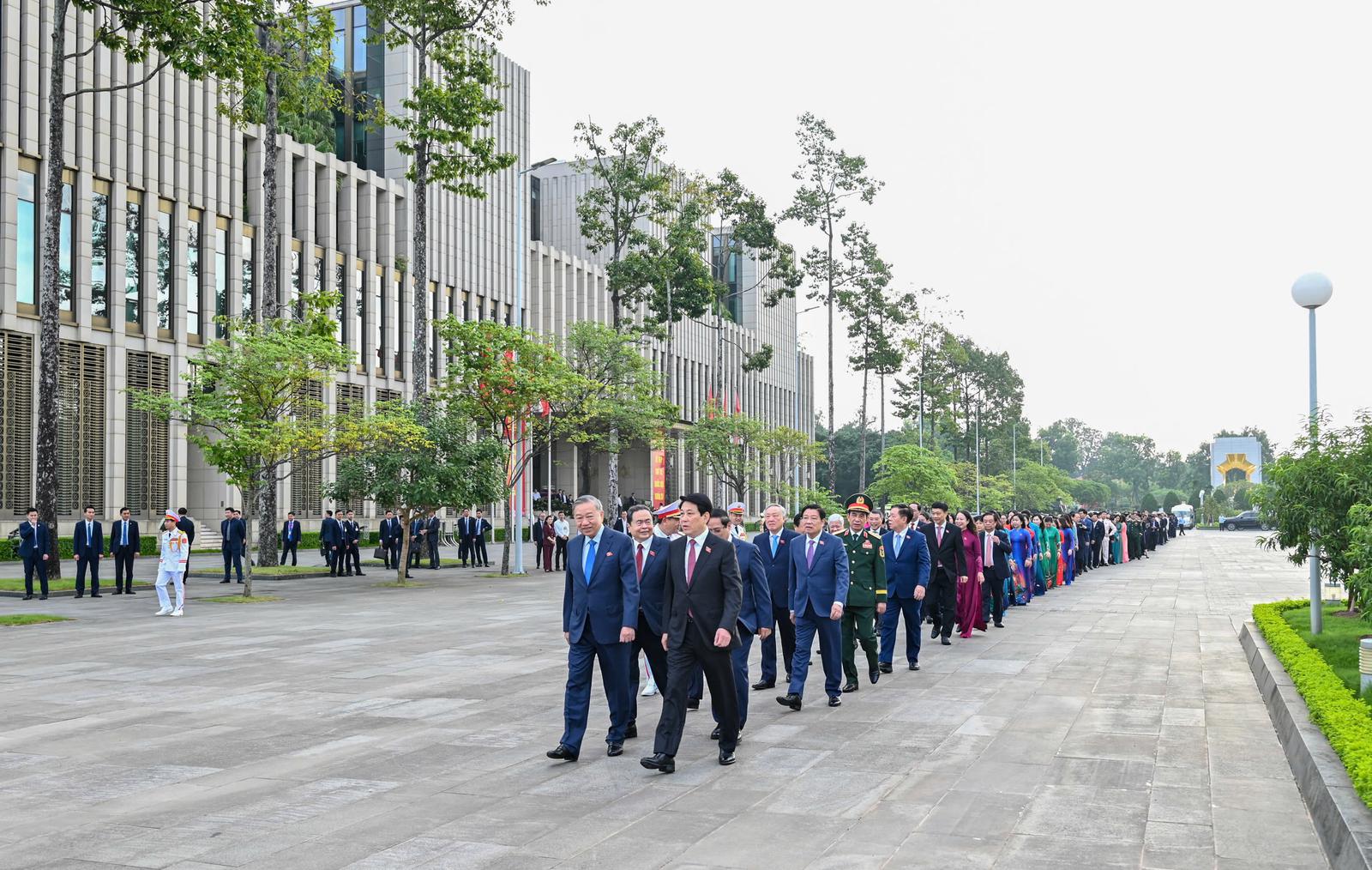 Tham dự Đoàn viếng có Tổng Bí thư Tô Lâm, Chủ tịch nước Lương Cường, Thủ tướng Chính phủ Phạm Minh Chính, Chủ tịch Quốc hội Trần Thanh Mẫn, Thường trực Ban Bí thư Trần Cẩm Tú, Chủ tịch Ủy ban Trung ương Mặt trận Tổ quốc Việt Nam Đỗ Văn Chiến.
